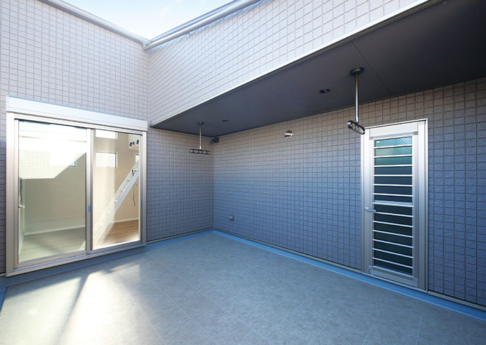ランドリーからクローゼットへ一直線に繋がる、計算された洗濯動線。広々としたバルコニーには一部屋根を設け、急な雨にも配慮しました。リビングの延長として、休日のオープンエアーリビングにもなる心地よい空間です。