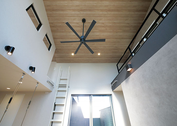 ❶高い天井が開放感を高めるリビングには、空気を循環させるシーリングファンを。梯子で登るロフトはワクワクする秘密基地のよう。バルコニーへと続く大きな窓を開け放てば、外の風と光が室内にたっぷりと満ちていきます。