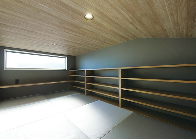 ❷梯子を上った先にあるのは、隠れ家のような低い天井が心地よいロフト。大容量の本棚と造作デスクに囲まれ、畳の上で寝転がりながら読書や作業も可能です。コンセントも完備した、自分だけの没入感あふれる空間です。