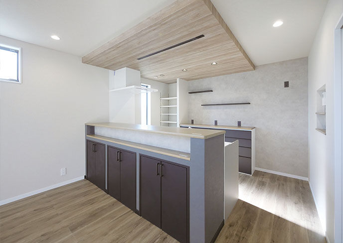 ❹木目調の下がり天井が空間のアクセントになるキッチン。便利なパントリーやカウンター収納も完備で機能的。