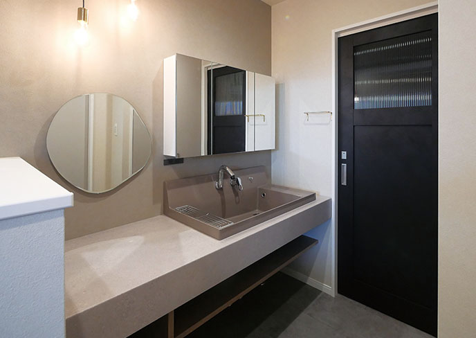 ❻親子で並べる広々とした洗面台。可愛らしい形の鏡とペンダントライトが彩る、毎日の身支度が楽しみになる空間です。