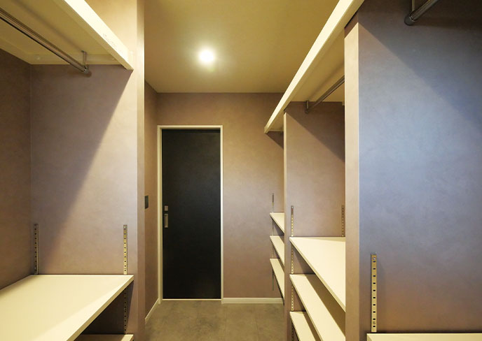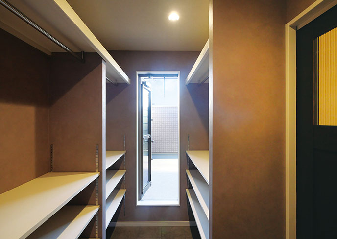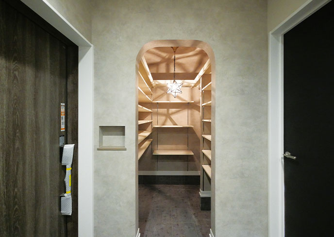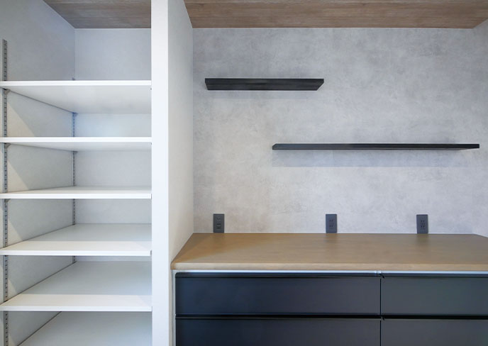❺アクセントウォールの裏に隠れた大容量収納。可動棚を充実させ、見せない工夫で日用品をすっきりと整理できます。