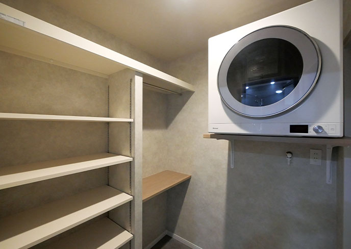 ❽ランドリールームには室内干しスペースと乾燥機を完備。スムーズな動線で毎日のお洗濯が楽しくなります。