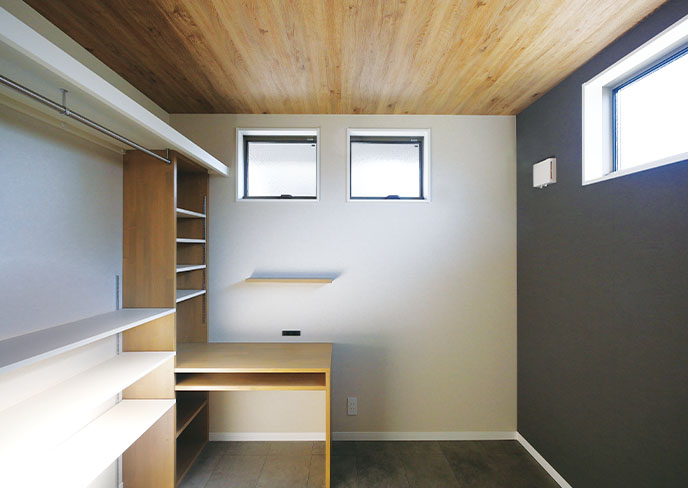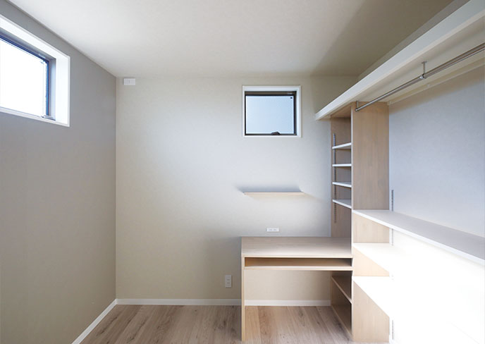 ⓬明るい日差しが入り快適な1階南側の洋室はそれぞれに、部屋のサイズに合わせて設計された造作デスクと、中身が一目でわかり、整理整頓がしやすいオープンクローゼットを採用した学習に最適な空間。