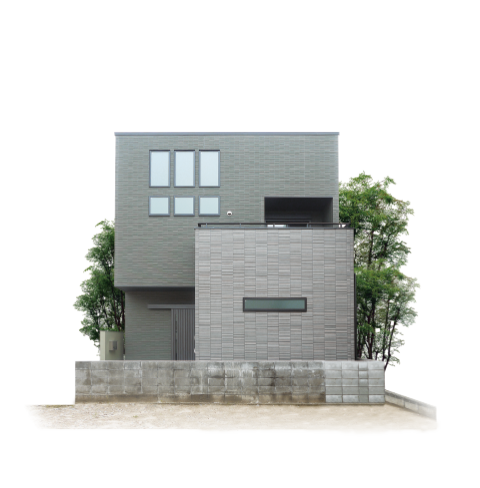 専用通路の奥にはゆったりとした貫禄のポーチがひろがる玄関へ。2パターンで貼り分けながらも、ナチュラルなアースカラーでまとめられた外壁の各面にはスクエアの窓が美しく並びます。