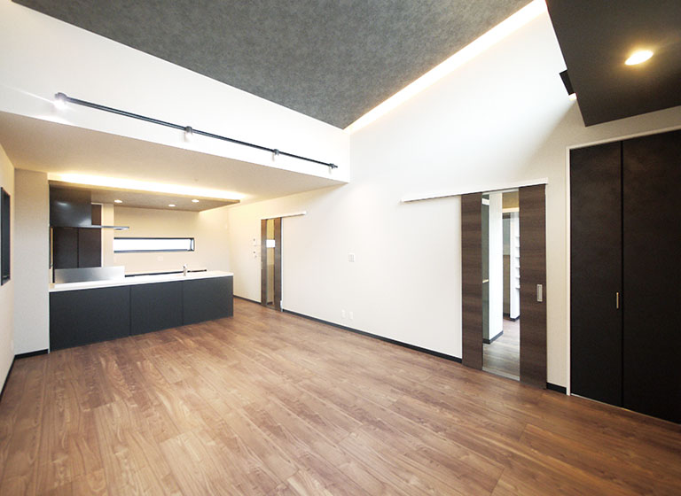 ❶リビングは開放的な勾配天井を採用。昼は南側の6連窓からLDK全体に採光を導き、爽やかな空間を。夜は化粧梁のダウンライト、勾配天井の間接照明が雰囲気のある空間を演出します。
