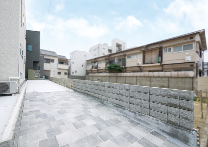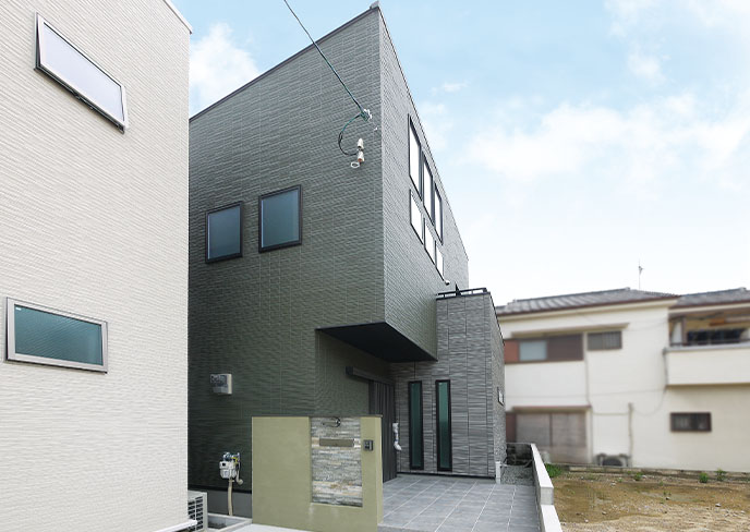 3台駐車可能な専用通路は道路側1台分のスペースをグレータイルで彩りました。アースグリーンのインターホンウォールも石目調タイルで装飾。夜には照明が灯り、上質な雰囲気を演出します。