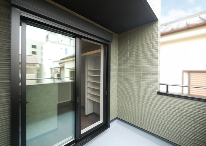 ファミリークローゼット、洗濯室につながる南向きバルコニーは、部分的に屋根のある奥行き1,800mmのゆったりサイズ。物干しとしての役割はもちろん、テーブルセットも置ける陽だまり空間。