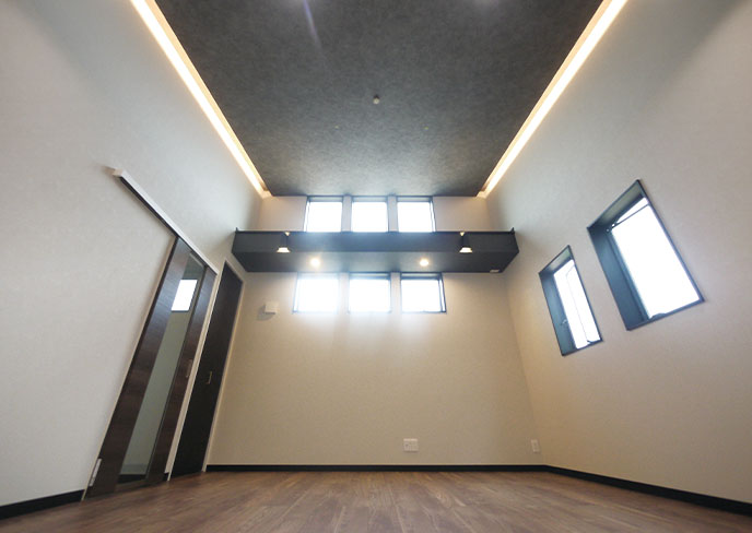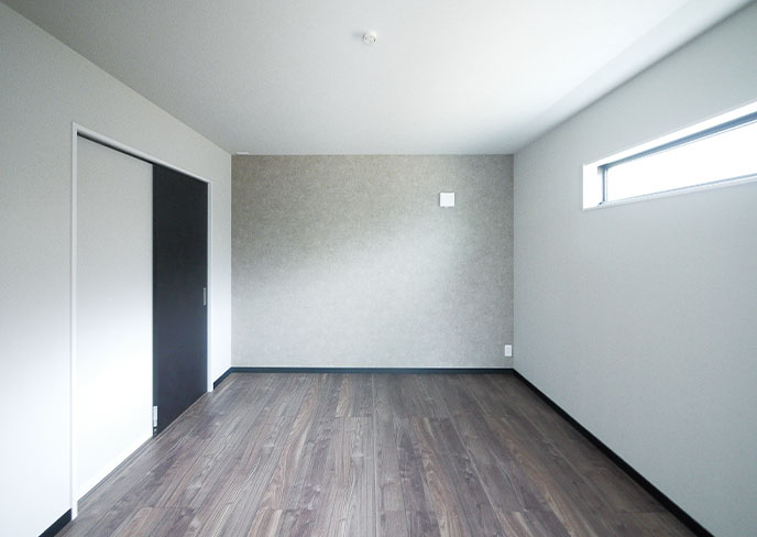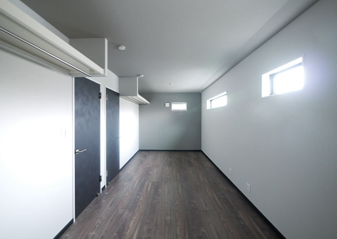 ❿主寝室は約8帖のゆったり空間。寝室を想定しているので大きな開口部ではなく各所にスリット窓を設計。