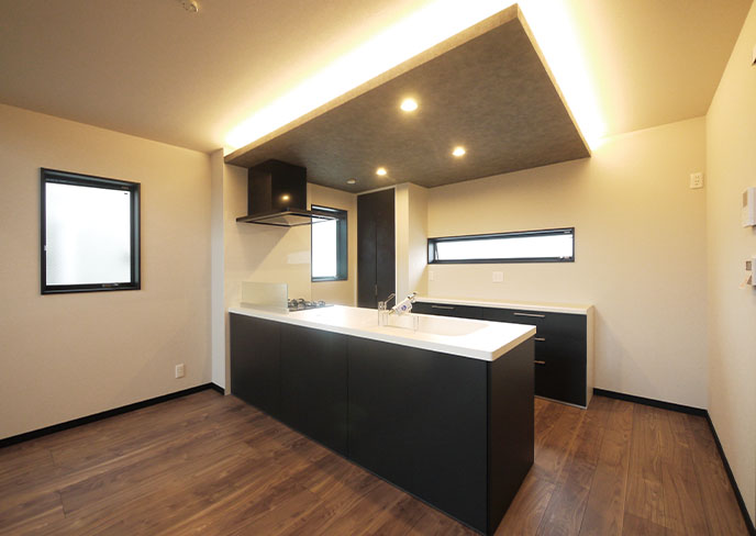 ❷下がり天井と間接照明を用い上質な空間を演出。パントリーを確保することで、カップボードは腰高にして、視線の圧迫を緩和。2階なので窓に囲まれた、心地良く明るいキッチンが実現しました。