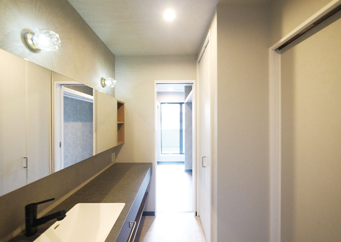 ❸脱衣所を兼ねた洗濯室からバルコニー・ファミリークローゼットが1直線に並ぶ、スムーズな洗濯動線。ドレッサー前にはリネン庫も完備。使う場所に収納することで生活が快適に流れます。