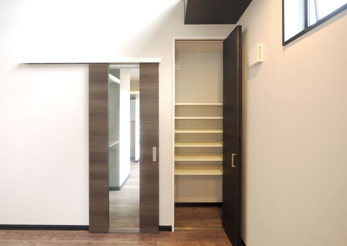 ❼シューズクローク側を通る家族用と来客用の2WAYエントランスを採用。玄関がいつもすっきり美しい状態を保てます。
