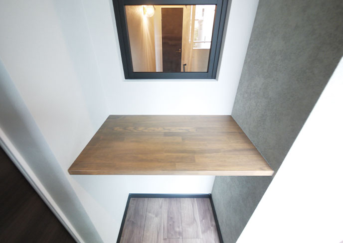 ❻ファミリークローゼットには、室内窓に面した、ちょっとした作業が行える家事カウンターを完備。
