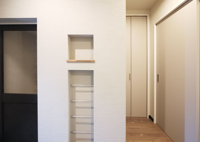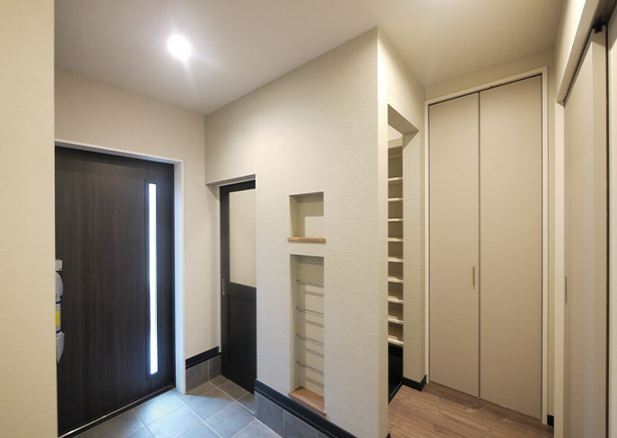 玄関にはウェルカムニッチと造り付けのスリッパラックを設置。余計なものを玄関に置く必要がありません。