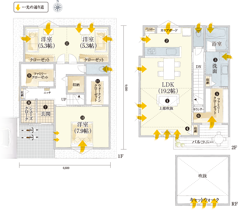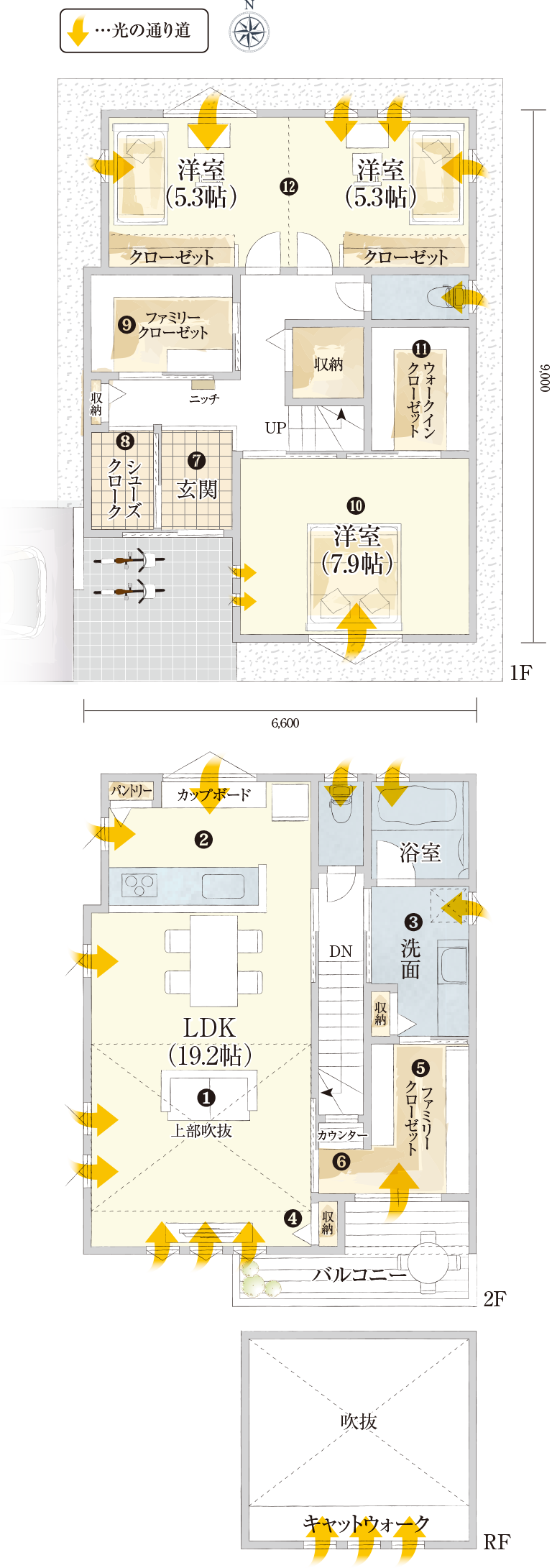 ❾玄関からシューズクロークを通り、その流れのままファミリークローゼットで着替えられる帰宅動線。